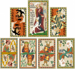 52 schöne Spielkarten und zwei Joker, mit denen man verschiedene alte Kartenspiele spielen kann. Inspiriert von den Bildern der Manessischen Handschrift